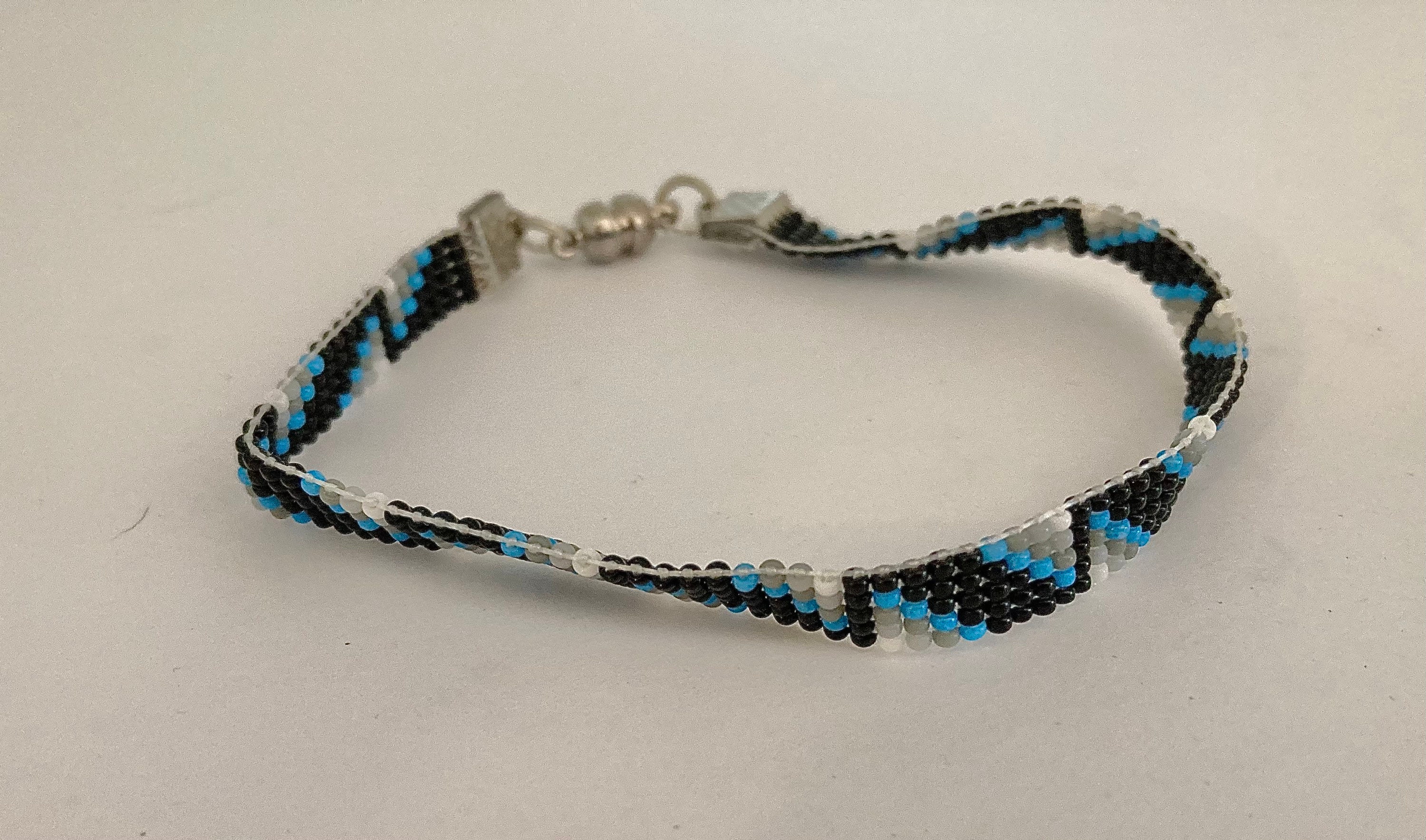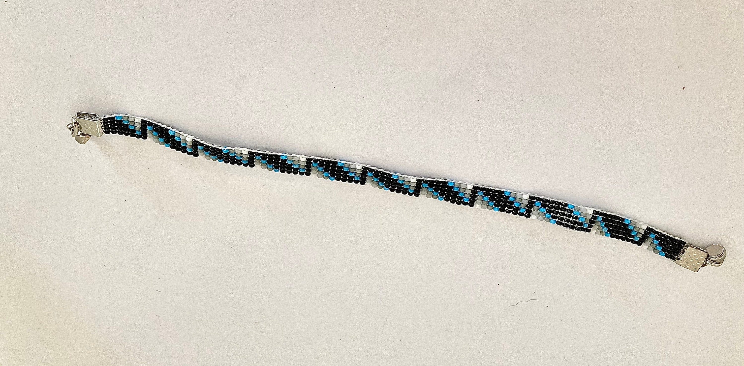 Casual yet sophisticated colors go well with jeans and casual wear. Diagonal stripes of black,blue,gray, and white give interest to this loom beaded bracelet.