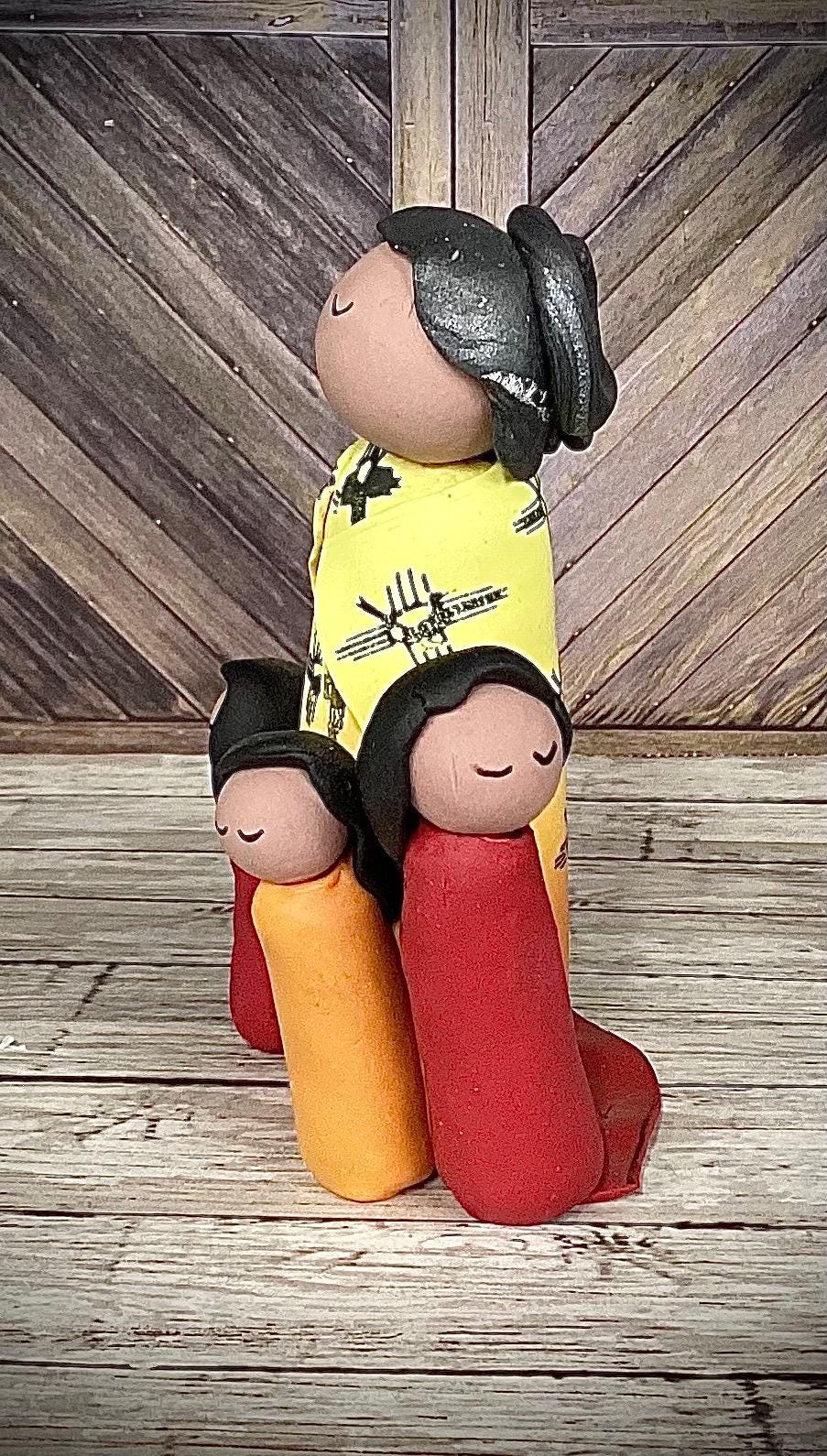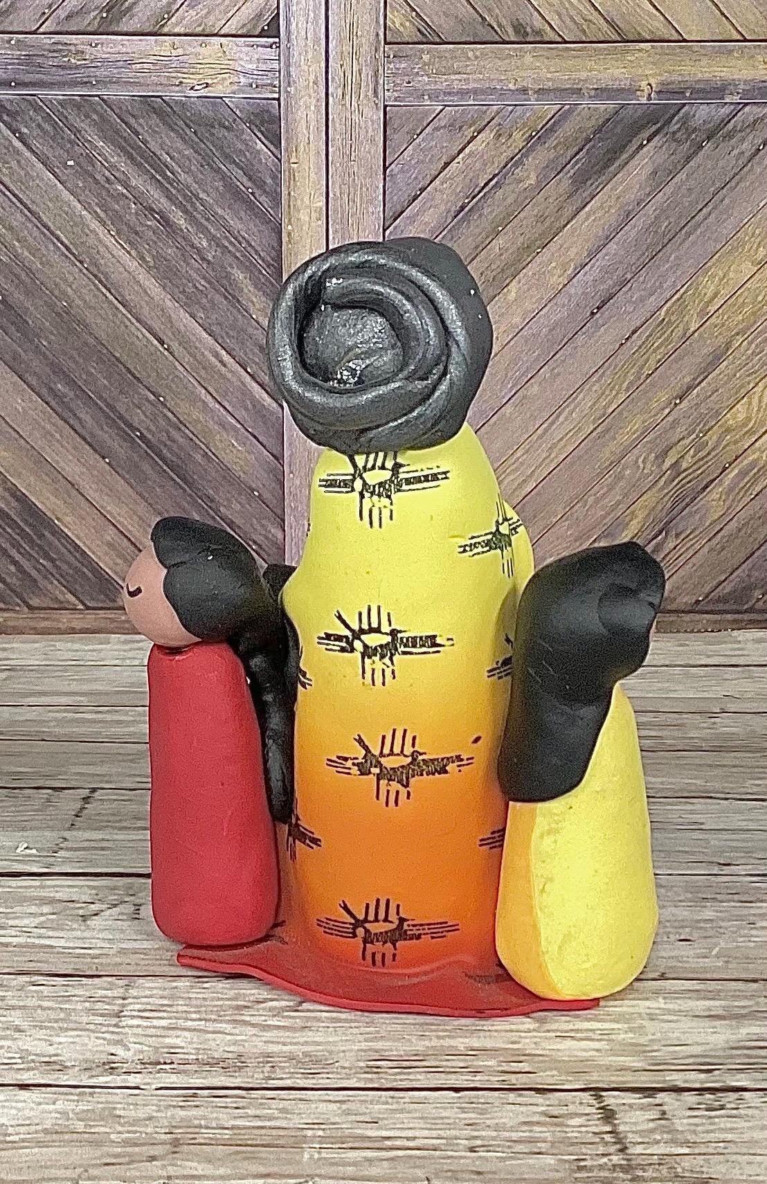 Sunset colored blankets embellished with Zia symbols clothe this grandmother as she teaches her four(4) grandchildren tribal lord. Created with polymer clay, this figurine is approximately 4&1/2 inches in height and 3&1/2 inches in width.