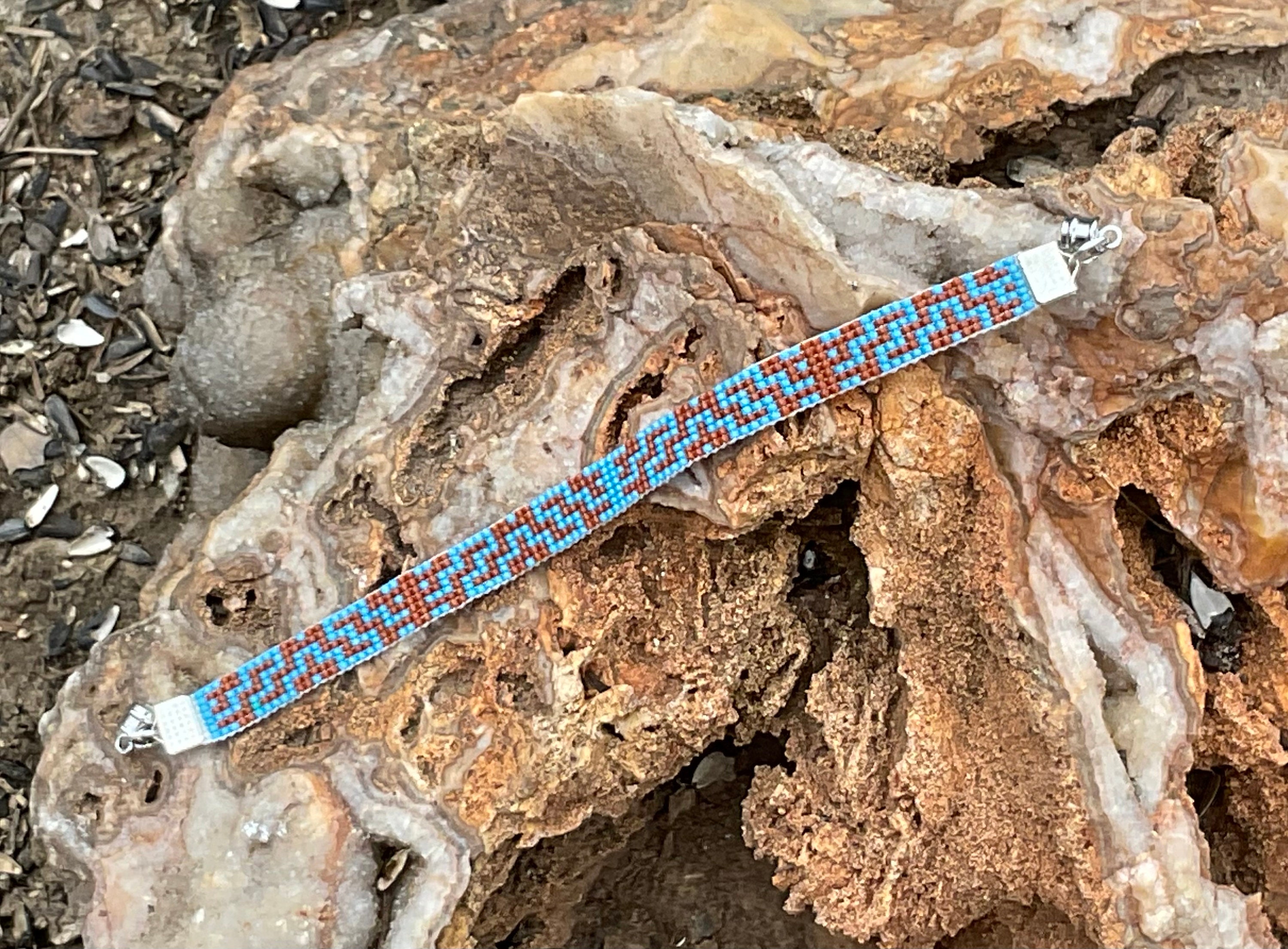 Loom beaded bracelet in blue with understated geometric pattern in darker red. Colors reminiscent of Southwest skies and contrasting mountains.