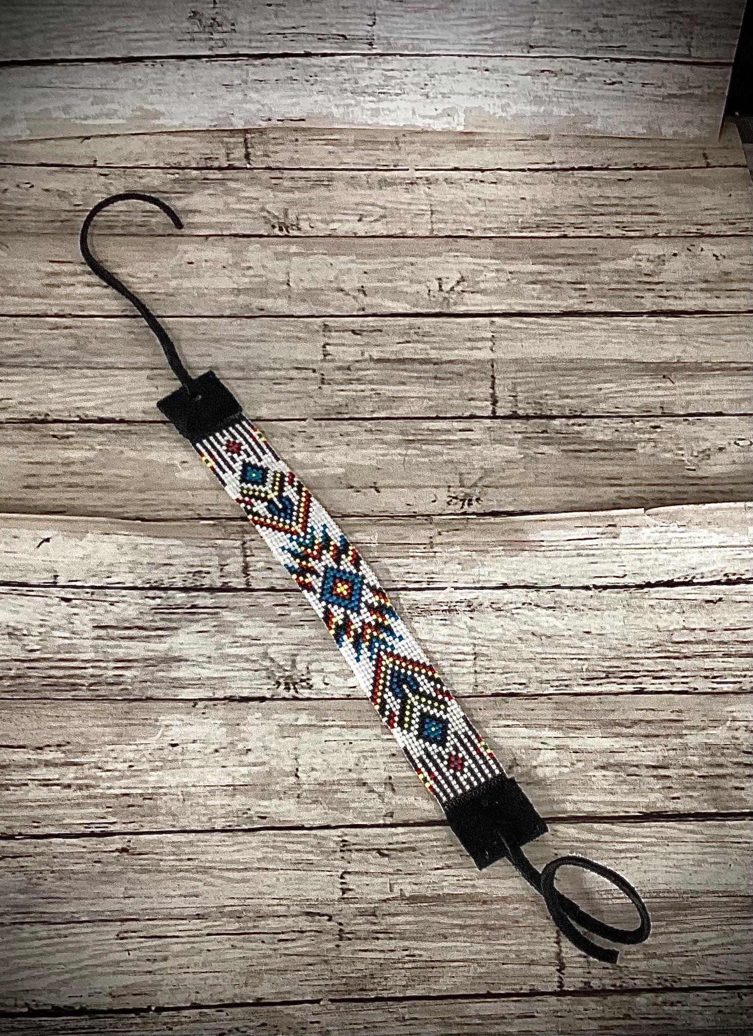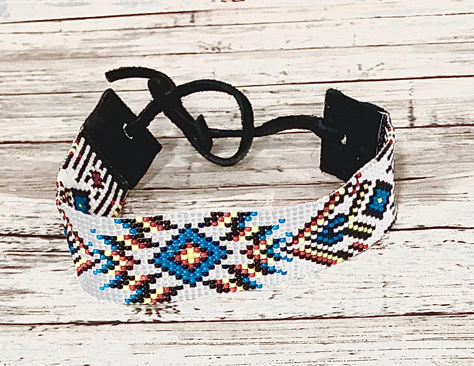 Loom beaded bracelet with white background setting off bold diamond, stripes, crosses and chevron patterns in an original design using black, red, yellow and dark turquoise blue.
