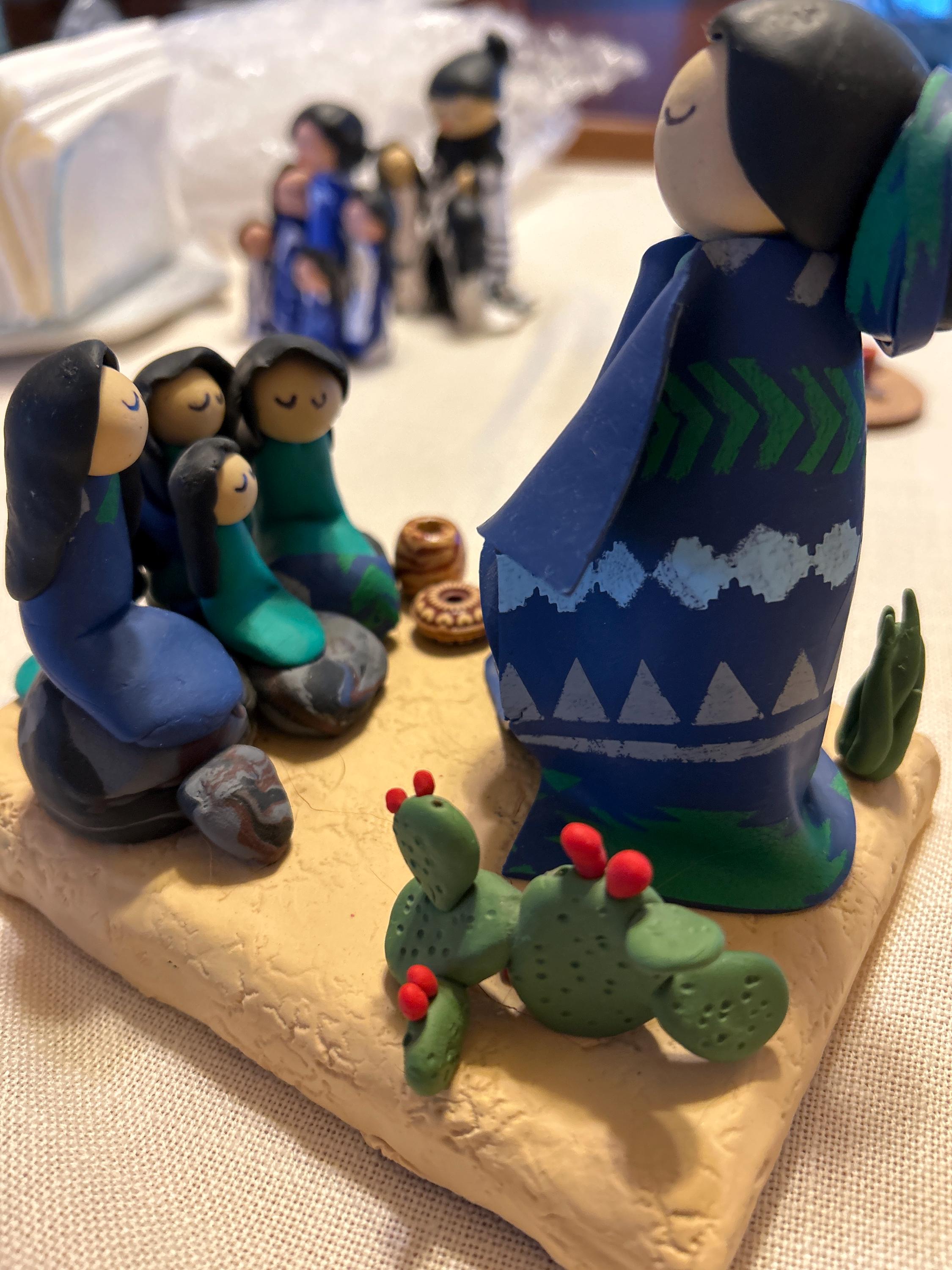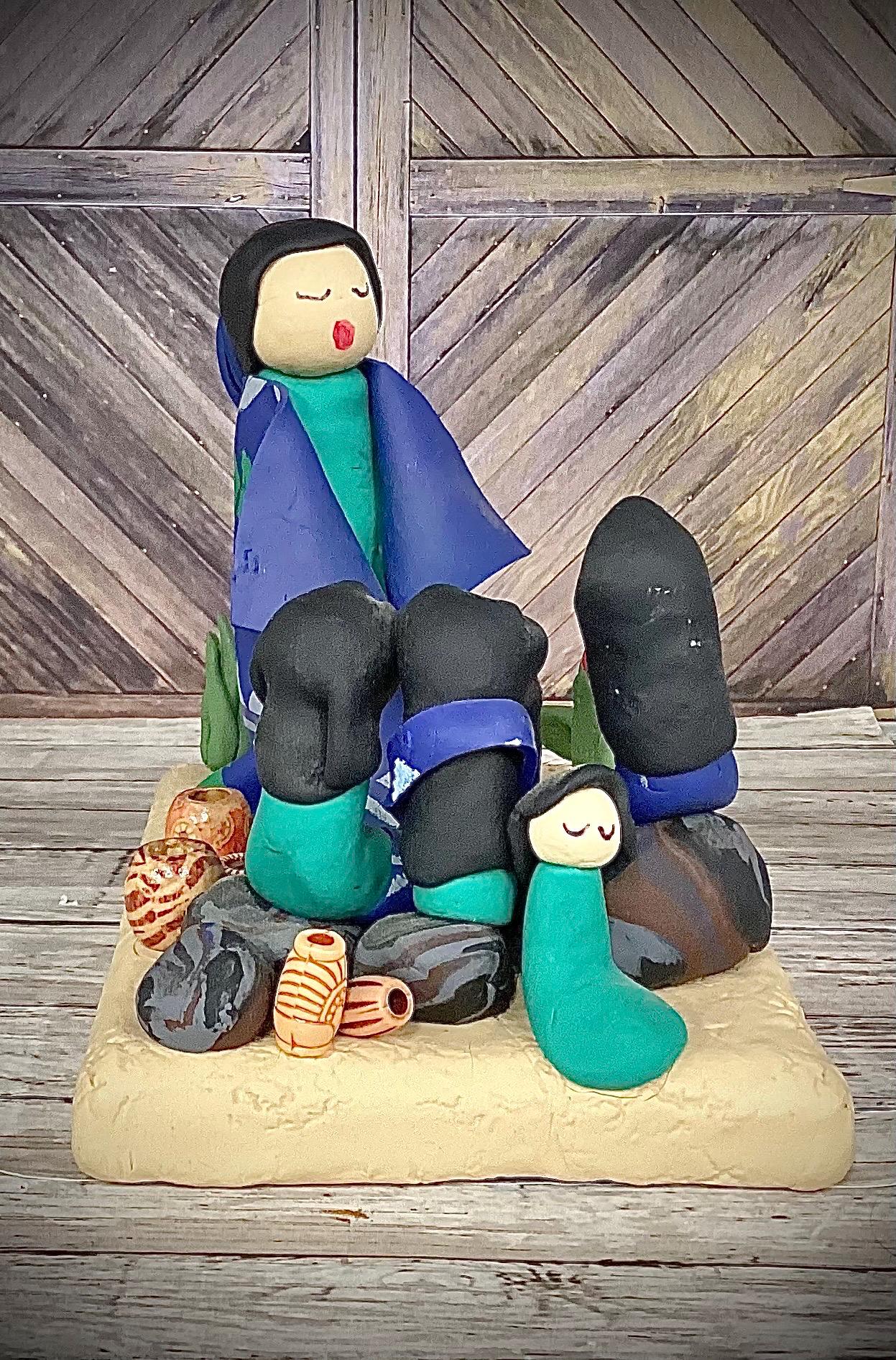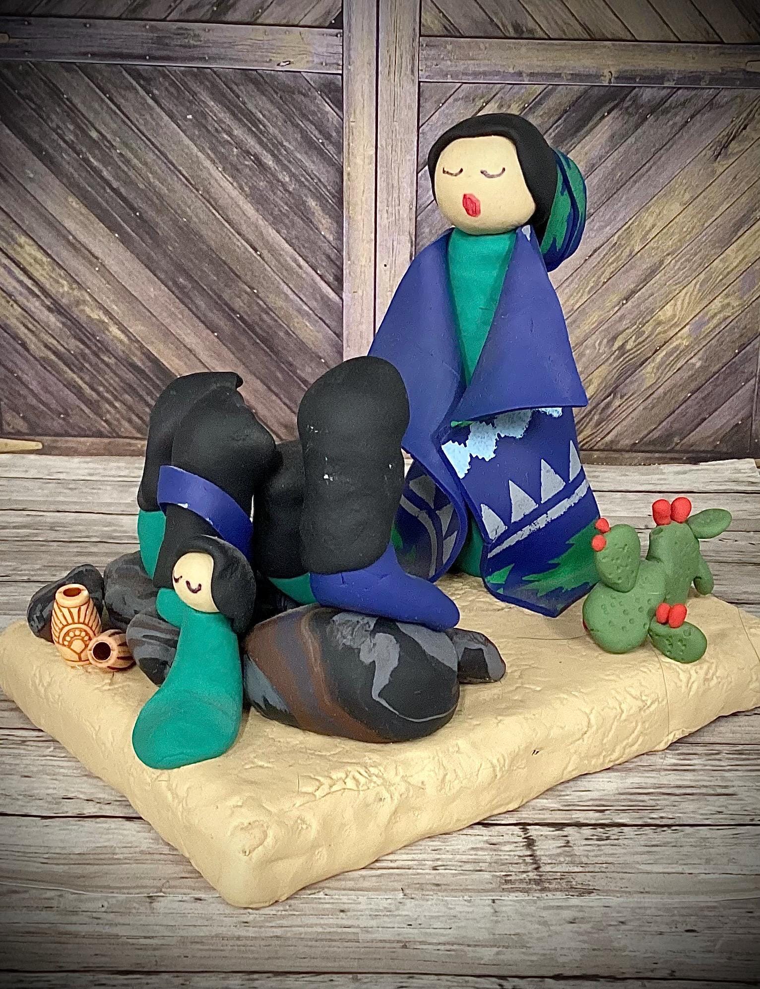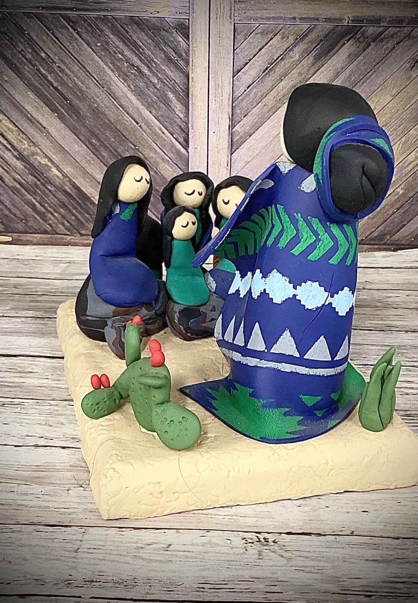 Collectible piece features storytelling grandmother in richly patterned blanket teaching cultural traditions and stories to 5 precious grandchildren. Accented with desert cactus, rocks and pottery. Polymer clay figures on a clay covered wood base.