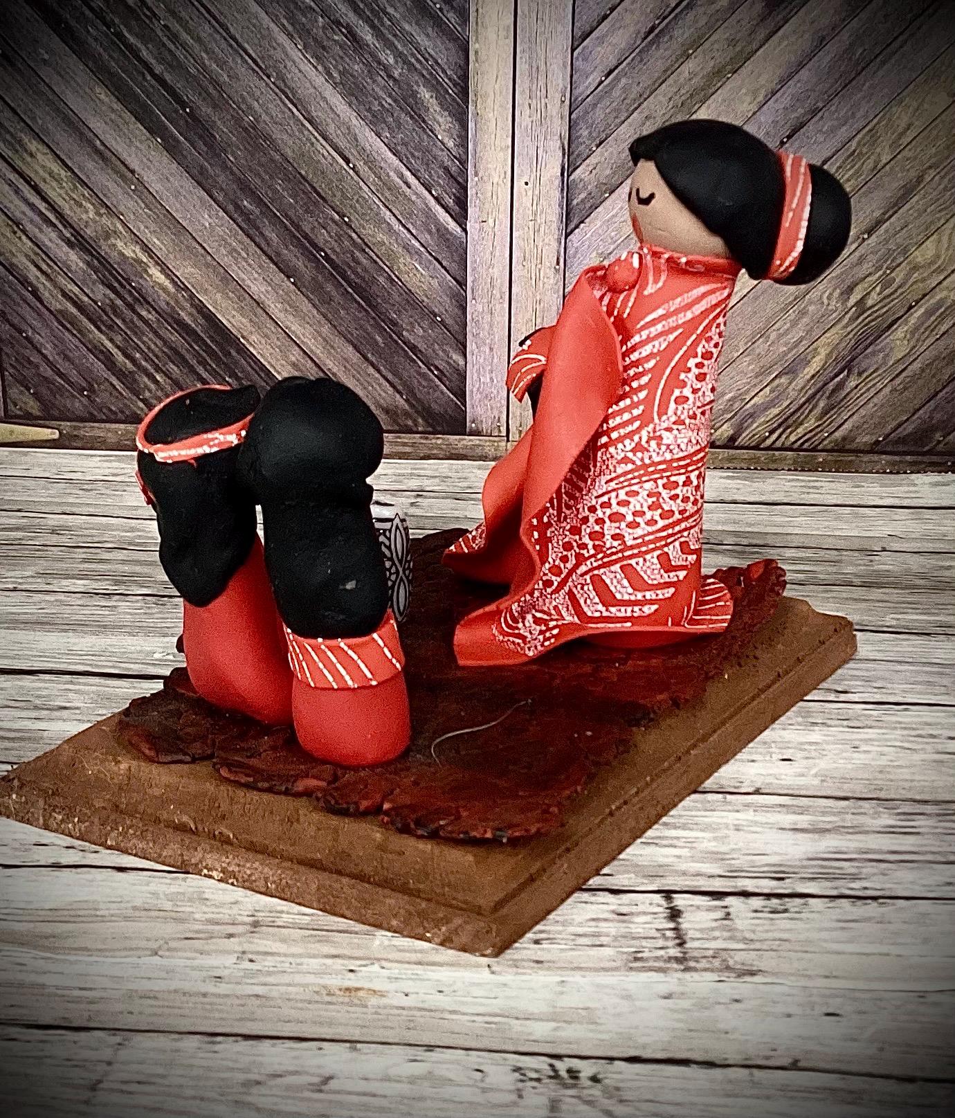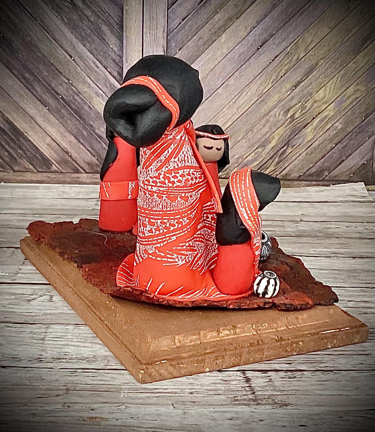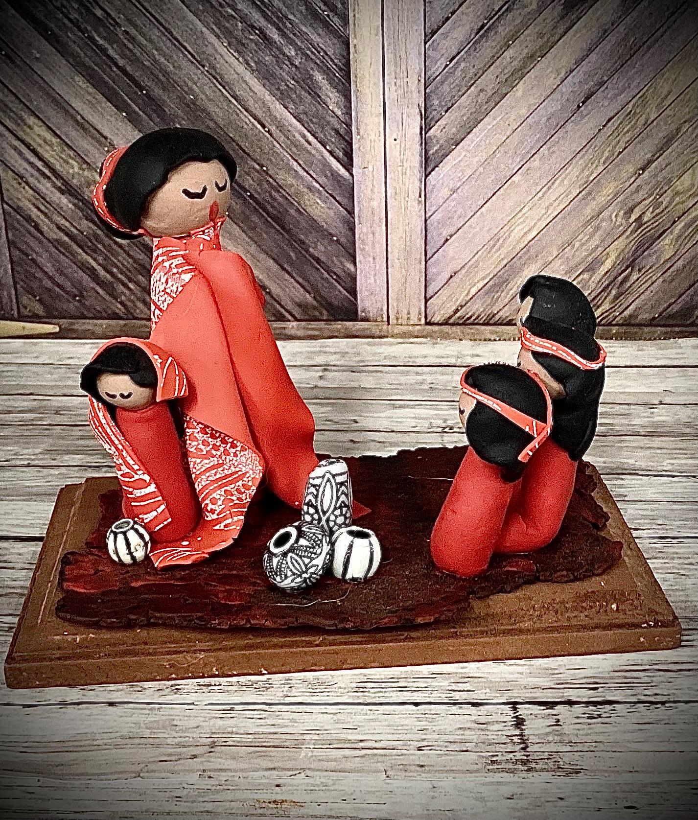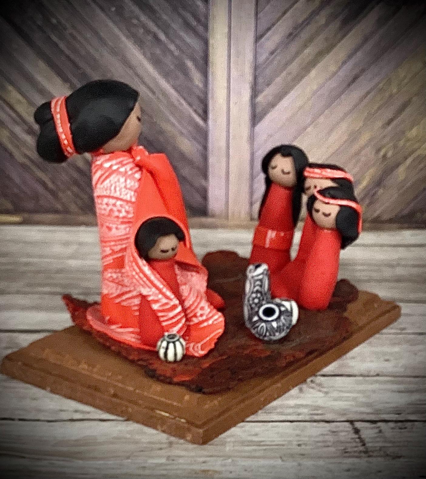 Beautifully silk screened red robe clothes this sweet grandmother telling stories and tribal legends to her four grandchildren also in red clothing. Polymer clay on a wood base. Accented with bead pottery.