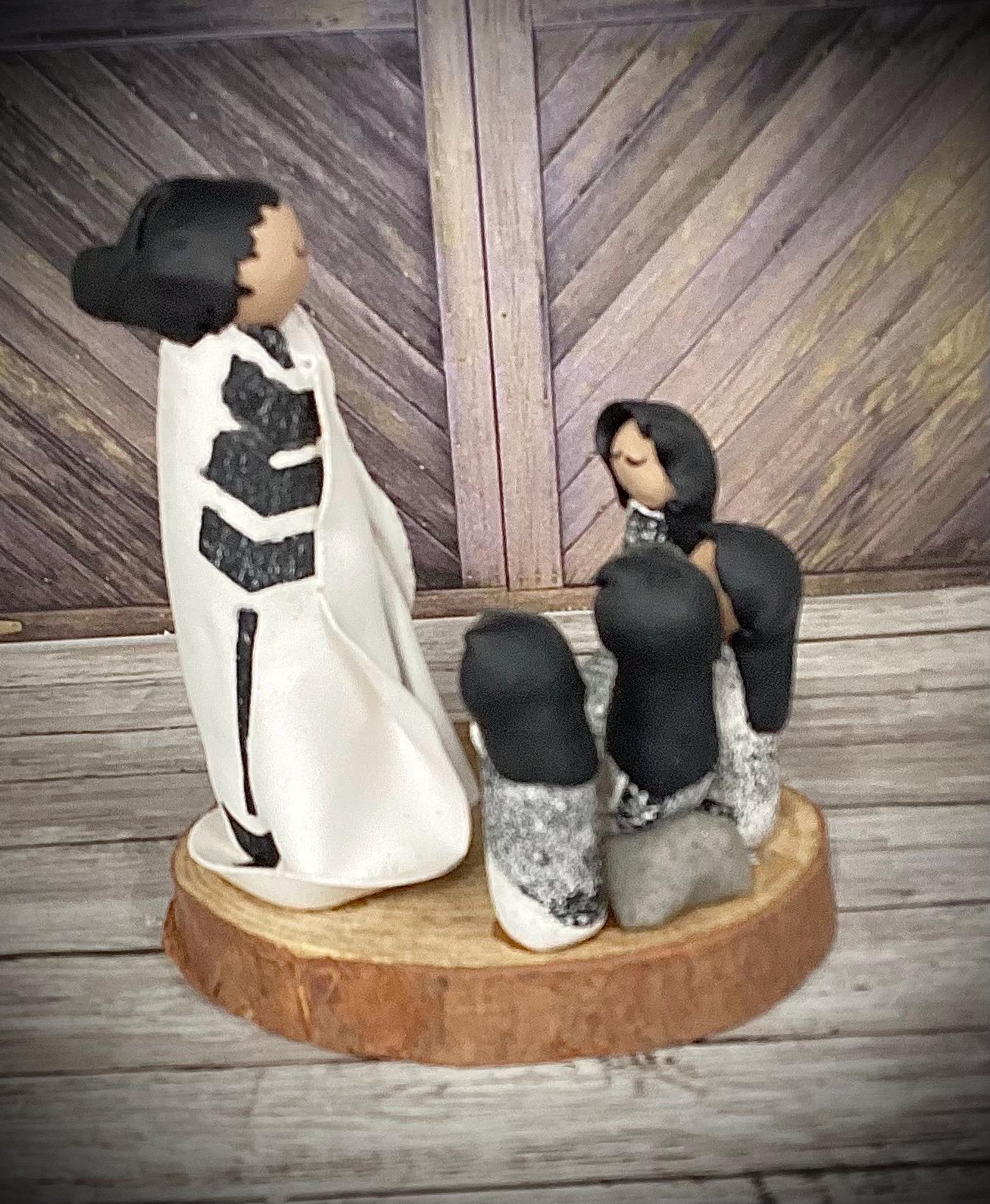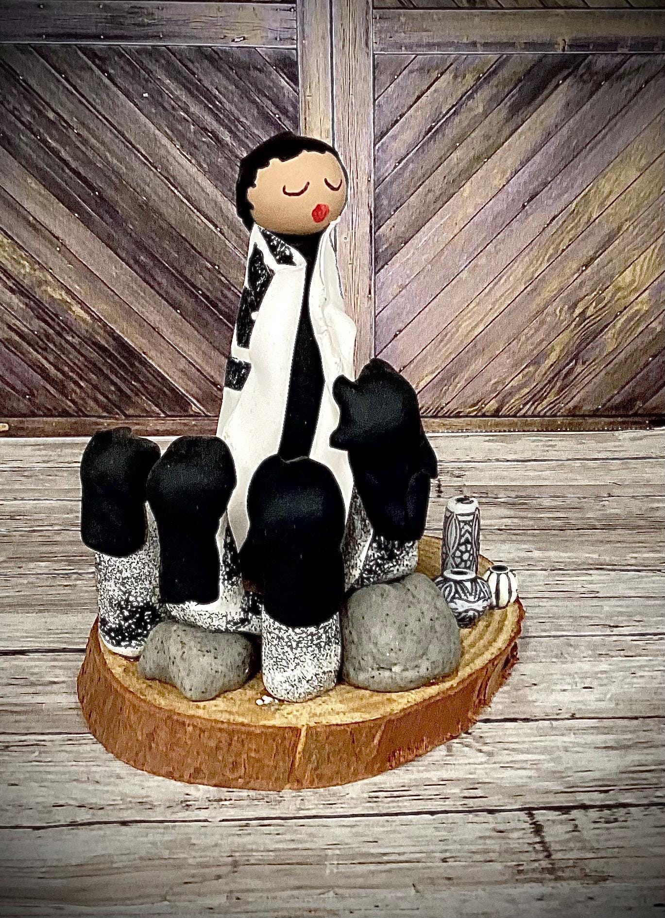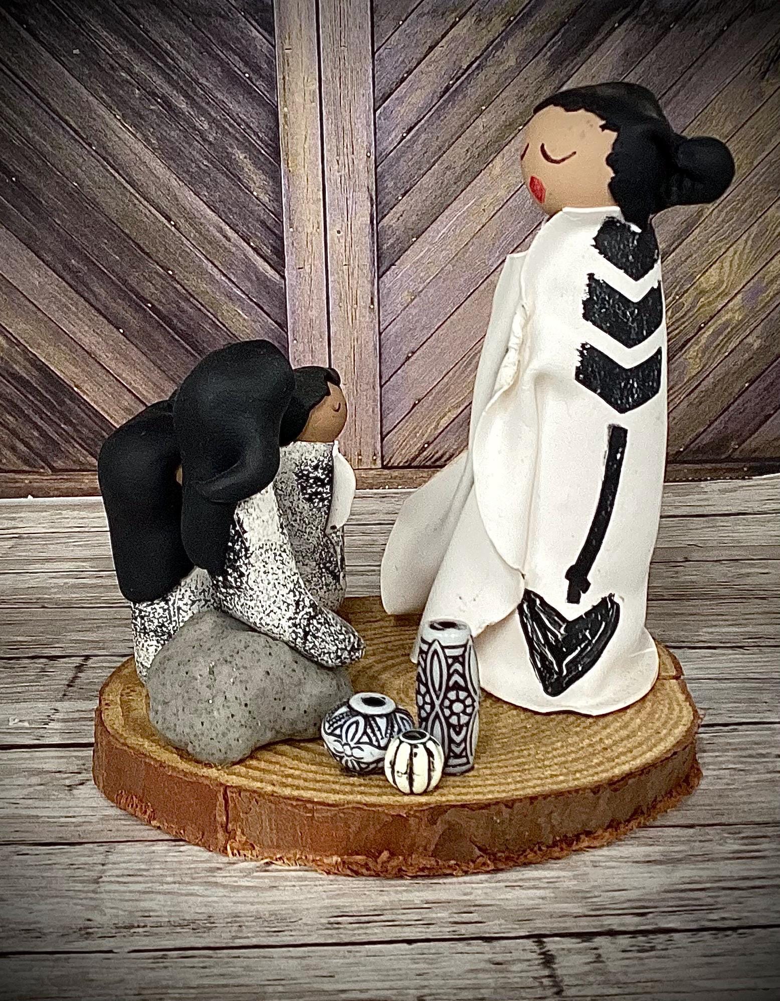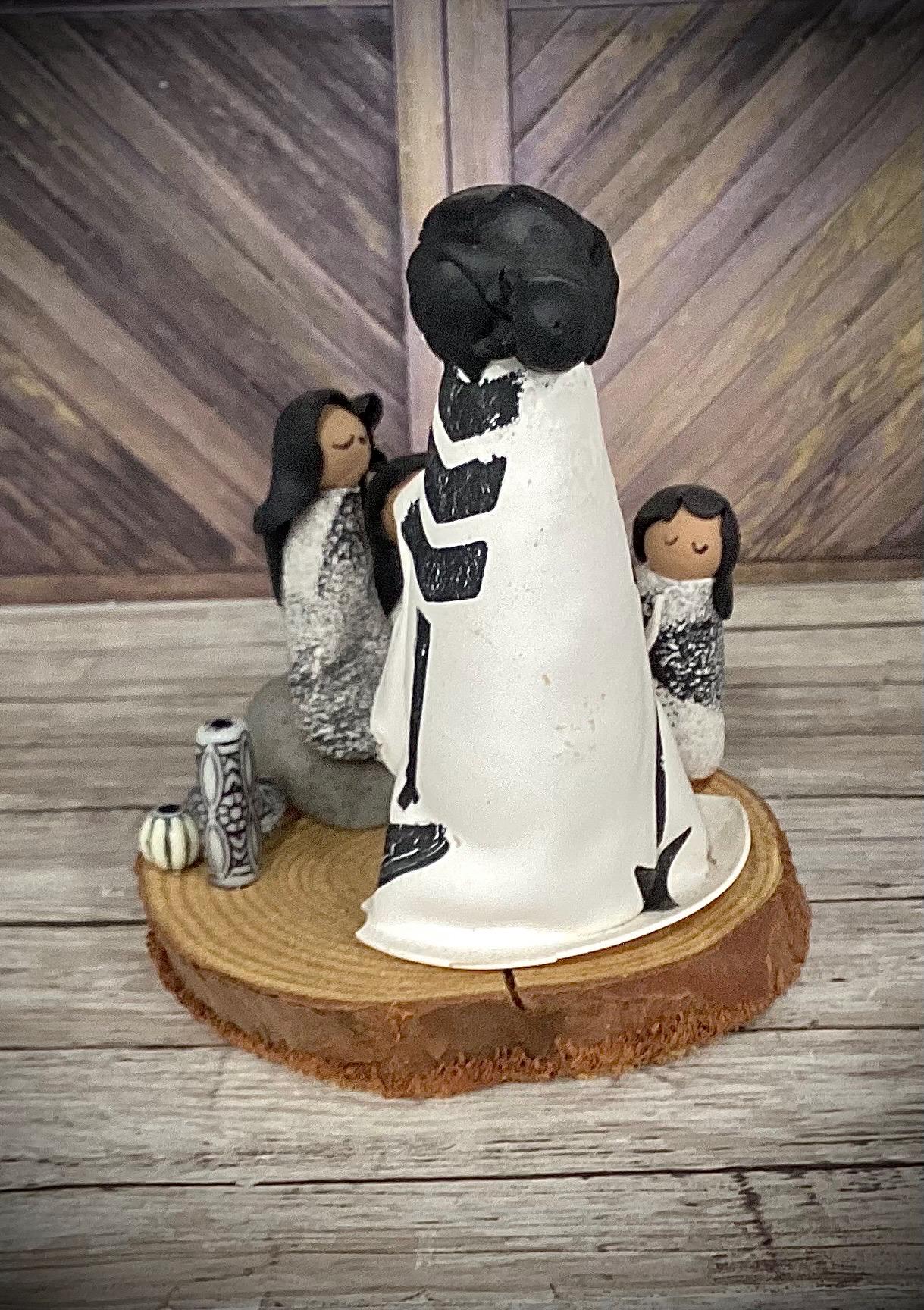 Grandmother and four grandchildren seated before her share lessons in tribal culture. Children seated on rocks while bead pots sit nearby. Polymer clay on wood slice base. Approximately 4&1/4 inches in height and 4 inches in width.
